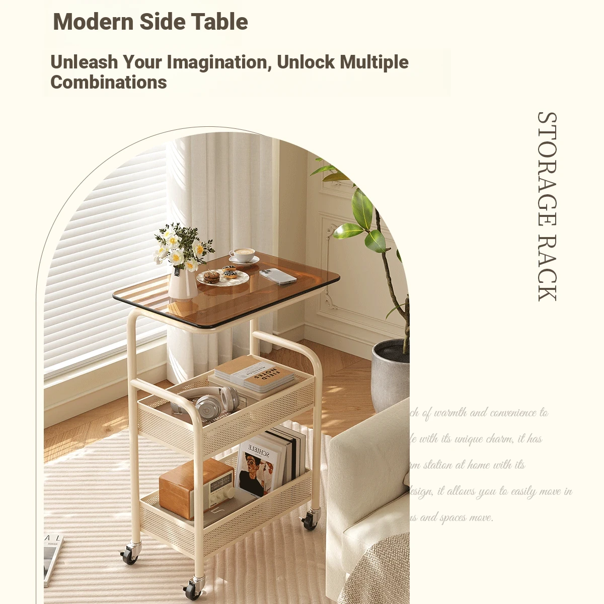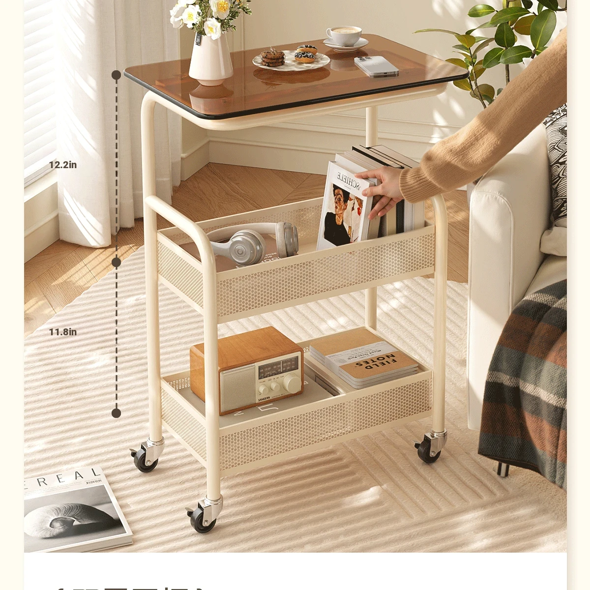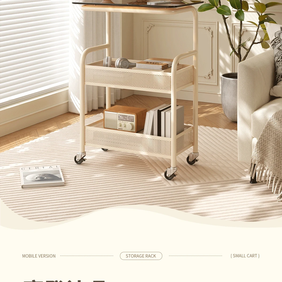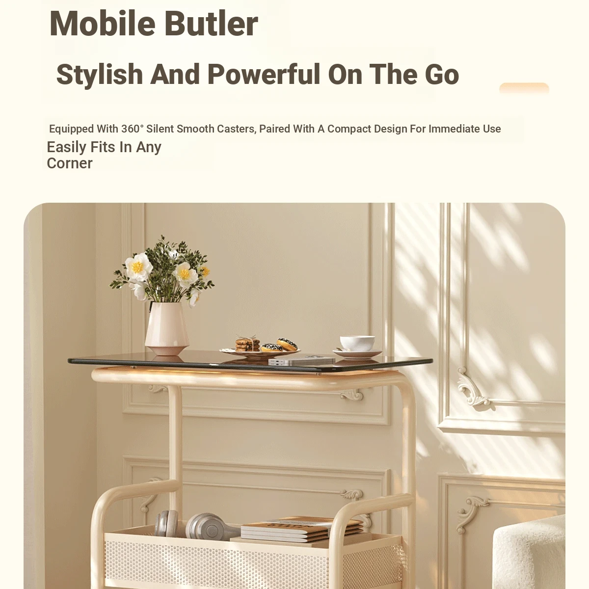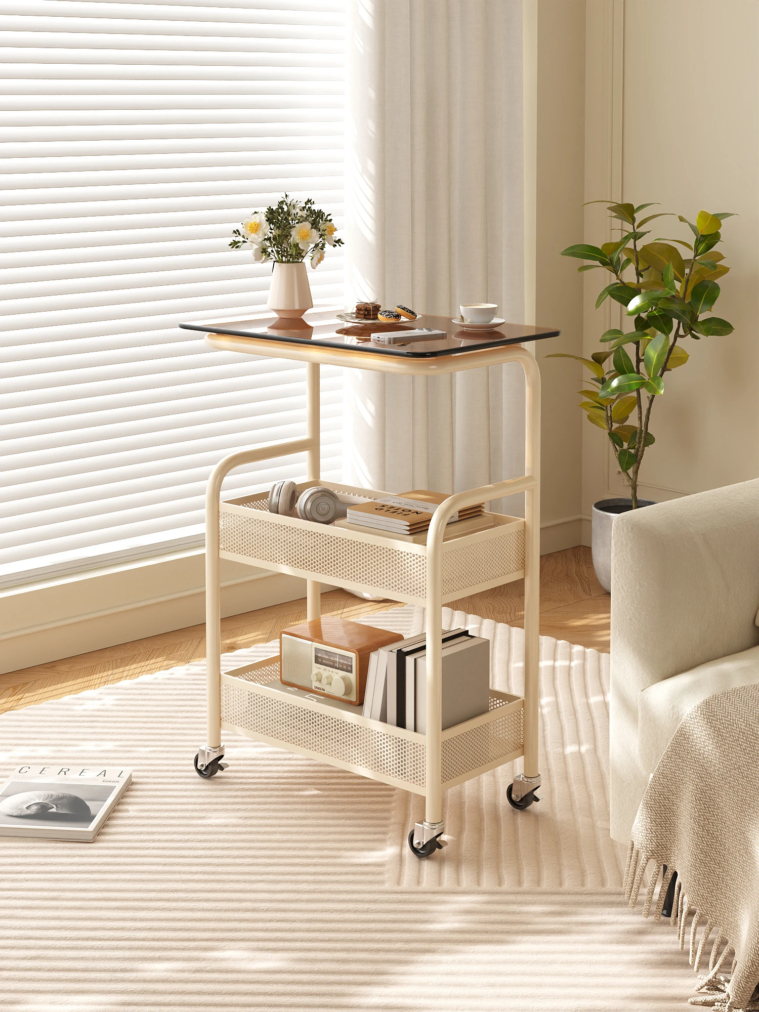 Mobile Snack Cart Table - Creamy Glass Side Table for Living Room, Sofa, or Bedside Storage - Perfect for Snacks and Small Items