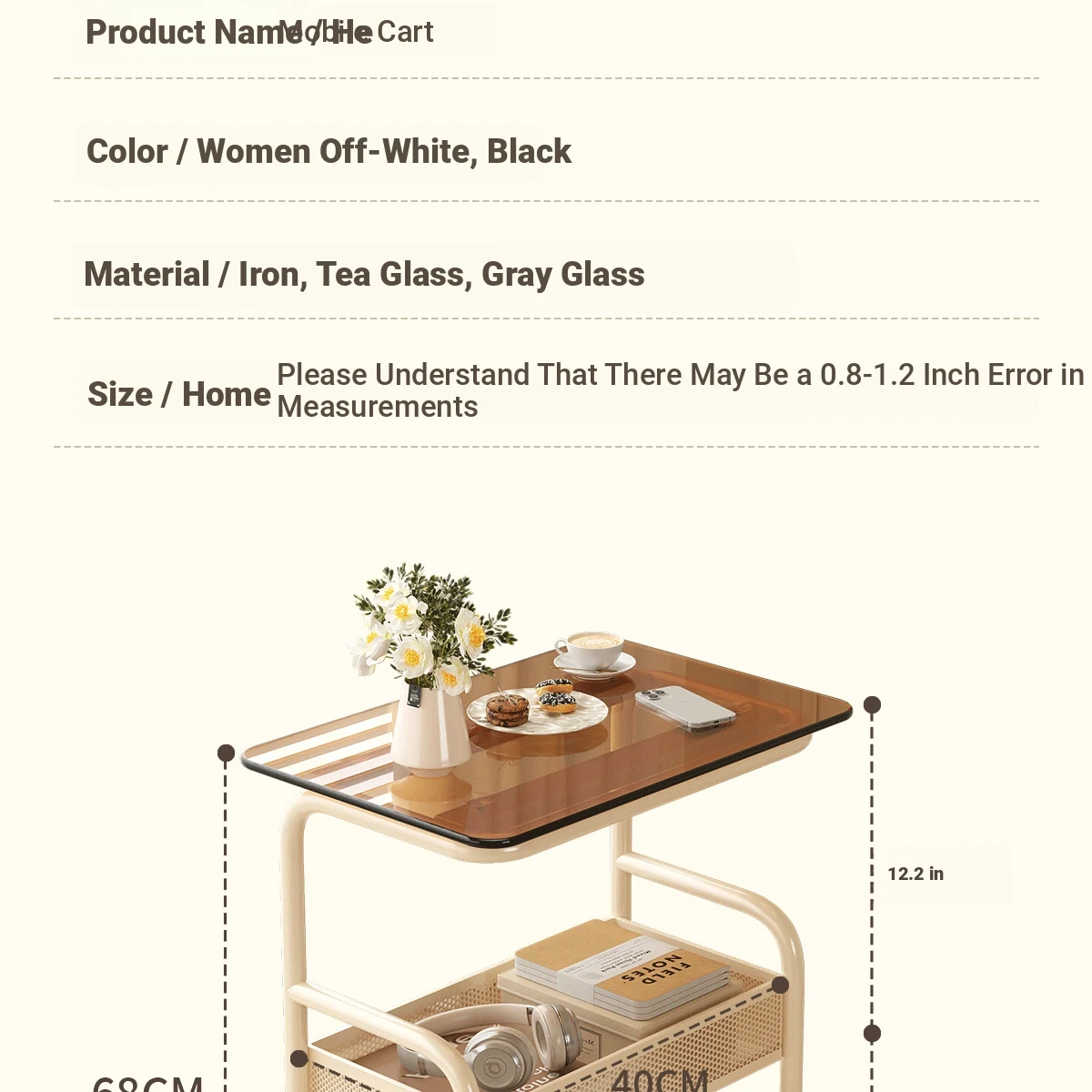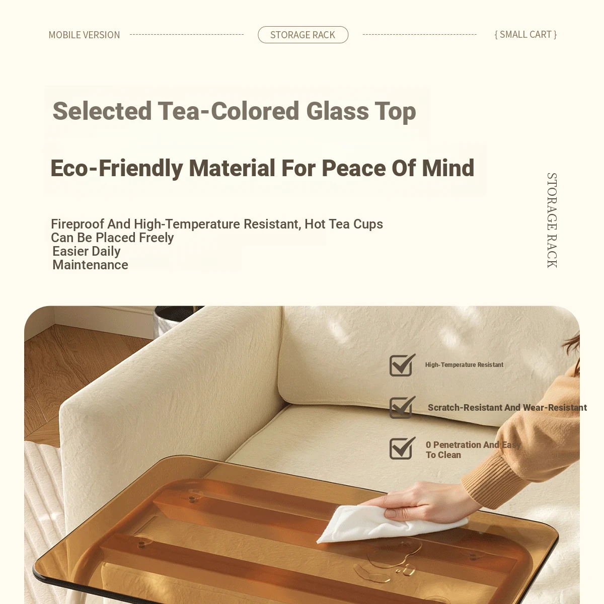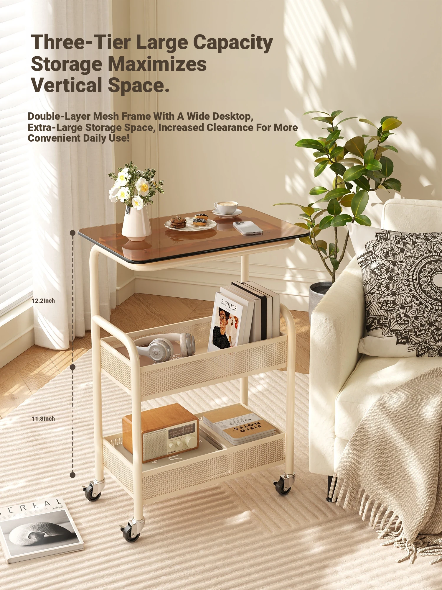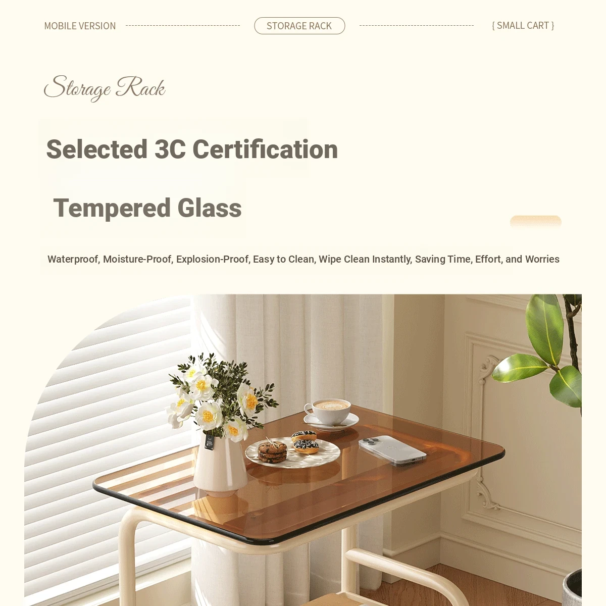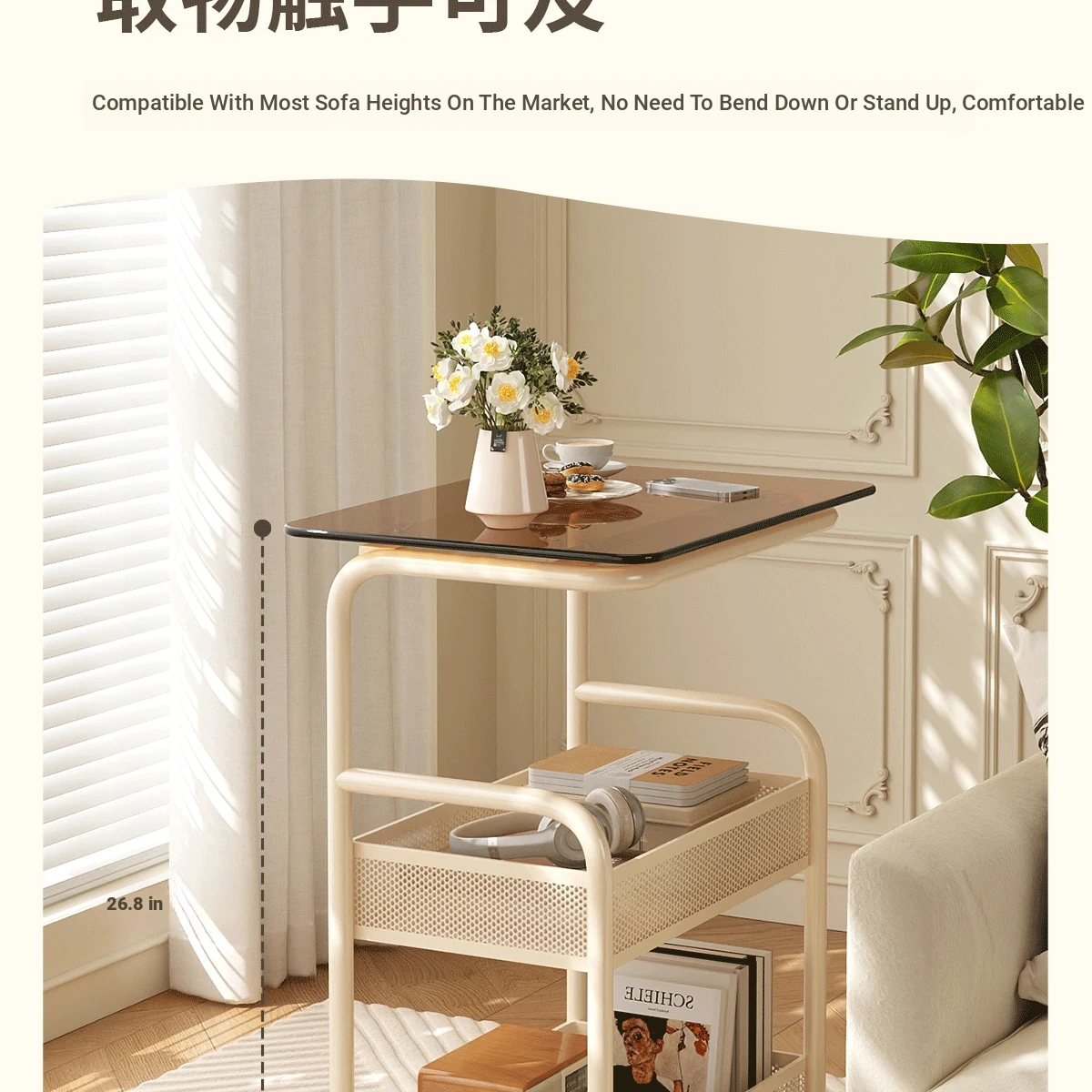 Mobile Snack Cart Table - Creamy Glass Side Table for Living Room, Sofa, or Bedside Storage - Perfect for Snacks and Small Items
