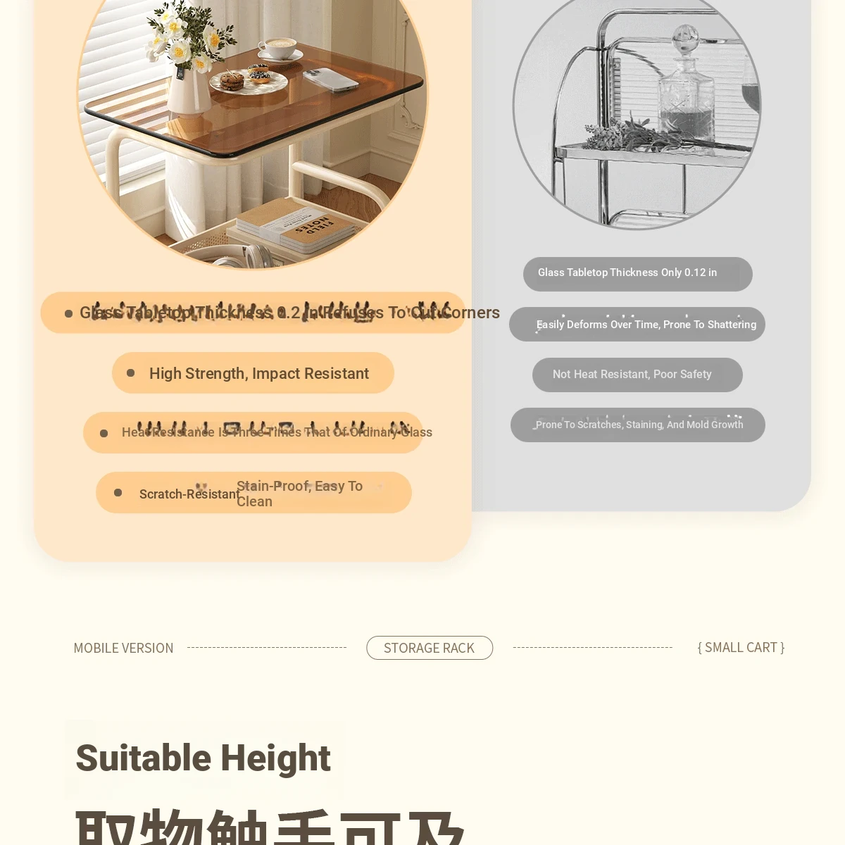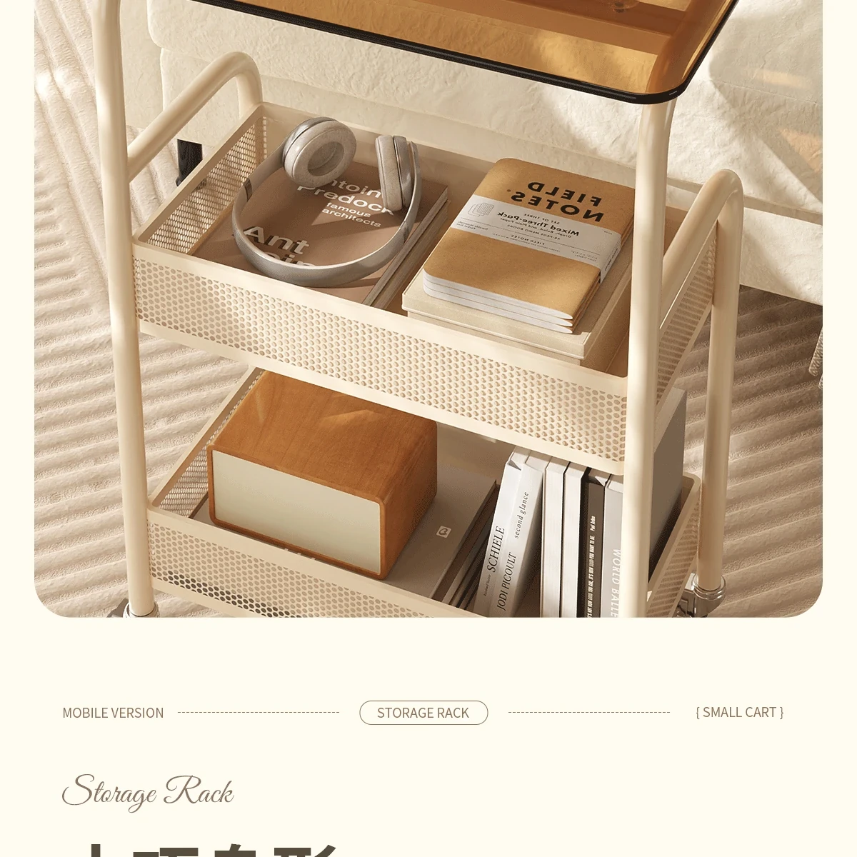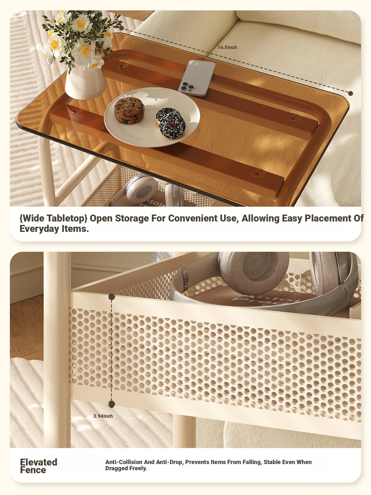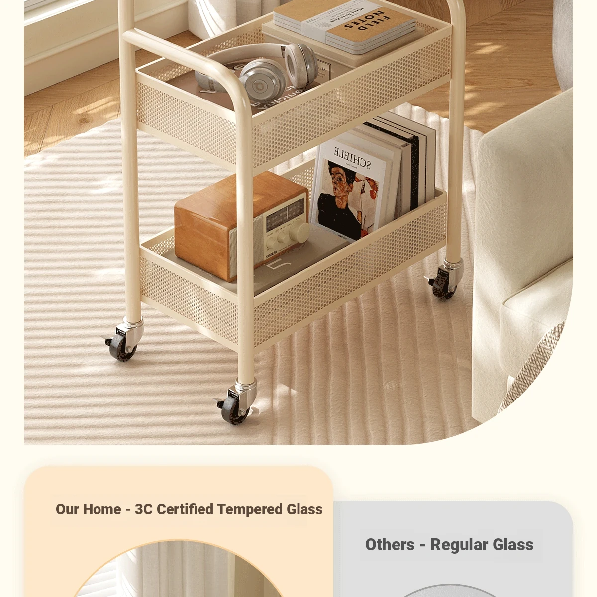 Mobile Snack Cart Table - Creamy Glass Side Table for Living Room, Sofa, or Bedside Storage - Perfect for Snacks and Small Items