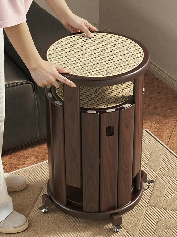 スタイリッシュな実木製スタッキングスツール - リビングにぴったりの藤編みデザイン!おしゃれな中華風シューズチェンジャーやティーテーブルとしても活躍。コンパクトに重ねられる便利な円形スツールで、使い勝手抜群です!