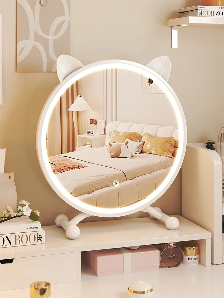スマートLED化粧鏡付きドレッサー用ミラー - 女子の寝室にぴったり!宿舎や学生に最適なテーブルタイプ、インスタ映え必至の丸型デザインで、メイクアップを楽しくサポートします。