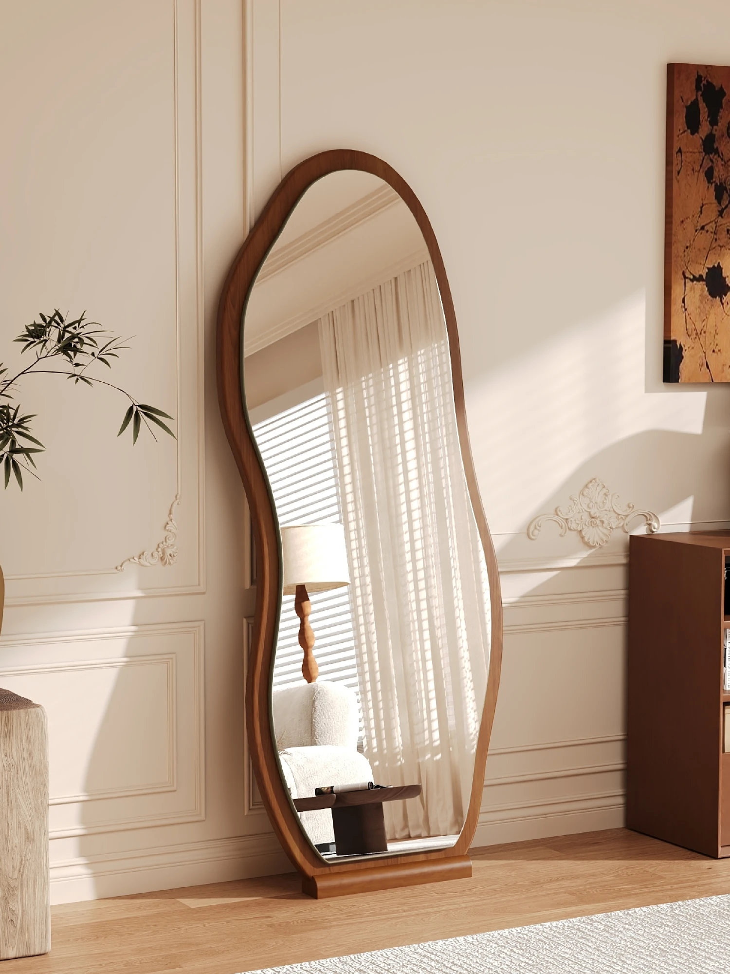 中古の全身鏡・フロアミラー|おしゃれなデザインで高級感溢れる!ユニークな形状のウォールミラー、女性のための試着に最適。家のインテリアを引き立てるアイテムです。
