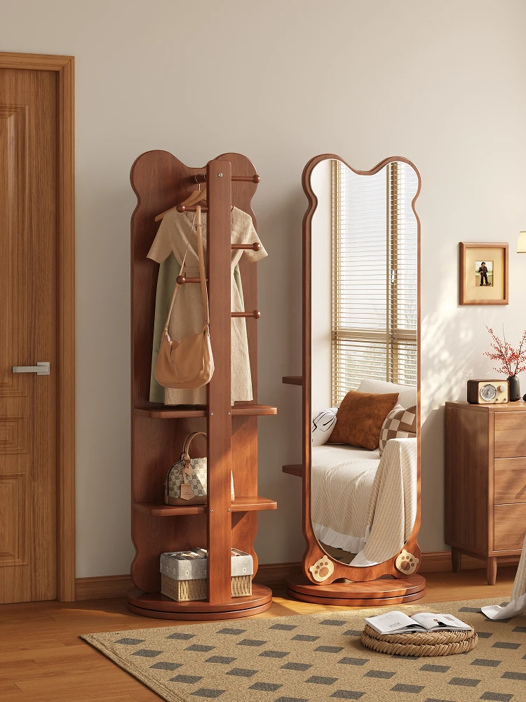 Wooden Bear Rotating Full-Length Mirror with Integrated Coat Rack - Portable Dressing Mirror for Home Use, Perfect for Trying on Outfits